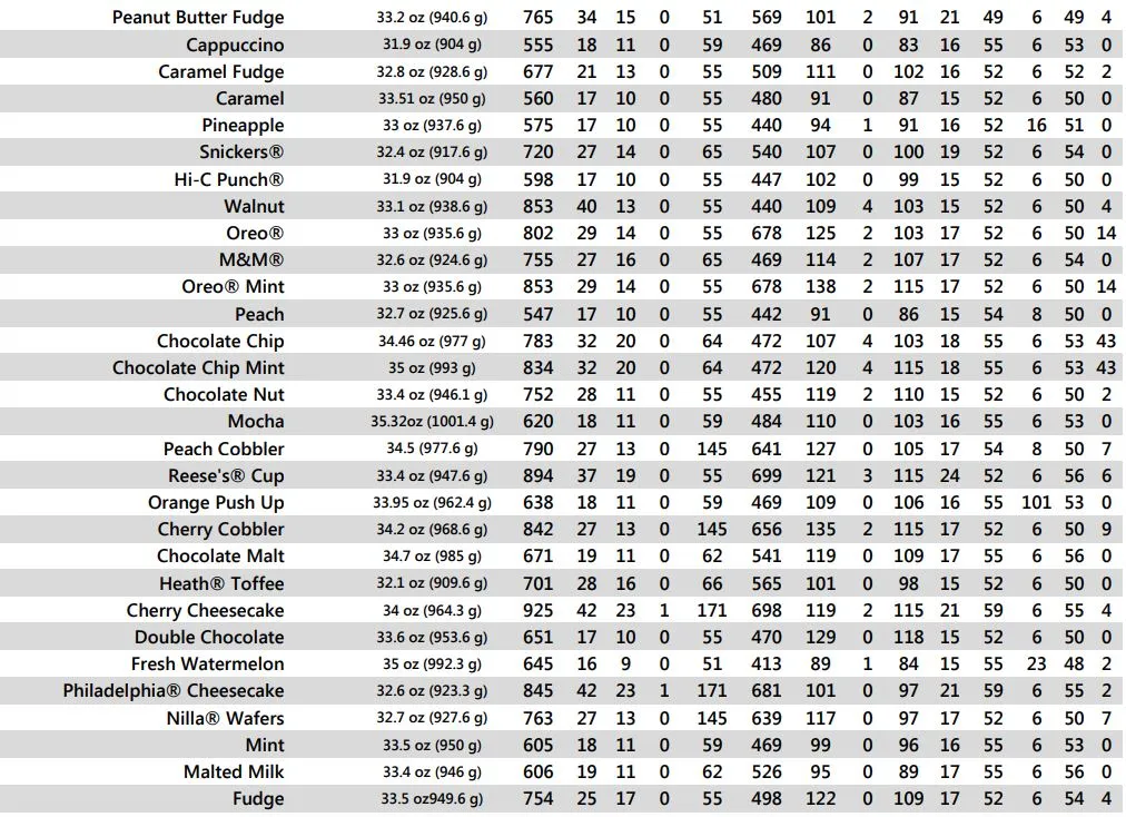 Cookout Nutrition Milkshake | Portion Size (oz) | Serving Size (g) | Calories | Total Fat (g) | Saturated Fat (g) | Trans Fat (g) | Cholesterol (mg) | Sodium (mg) | Total Carbs (g) | Dietary Fiber (g) | Sugars (g) | Protein (g) | Vitamin A (%DV) | Vitamin C (%DV) | Calcium (%DV) | Iron (%DV) |